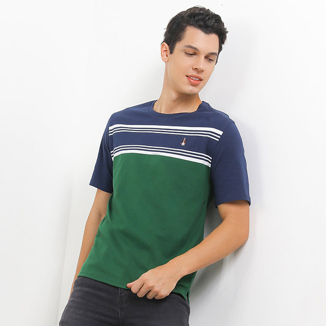 Description- Design: Casual tee with a bold chest stripe, combining simplicity with a touch of style.